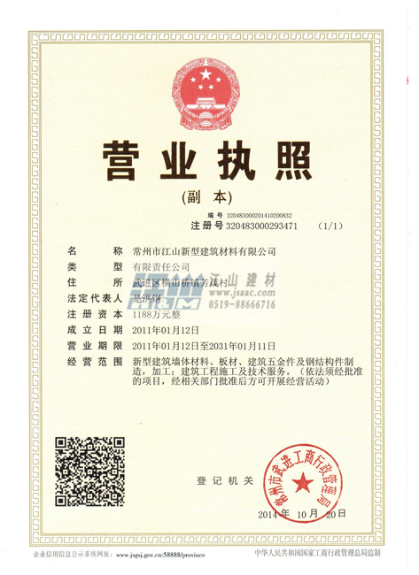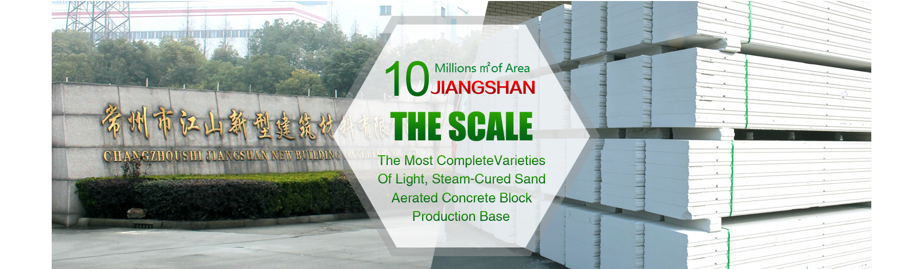 " /> Changzhou Jiangshan New Building Materials Co., Ltd located in Wujin District, Changzhou City Yokoyama Town Industrial Park. The company occupies more than 10 million square meters, 260 employees SHE people, the company invested nearly 300 million yuan in two phases, one has achieved annual output of 400000 autoclaved aerated concrete building material production capacity, two upcoming production, and the resulting 110 Articles (AAC) blocks and autoclaved aerated concrete slab production