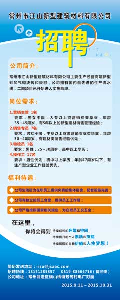 Changzhou New Building Materials Co. Jiangshan main production and operation of high-end new sand filling block brick and lumber, company has the most advanced production lines, two projects have begun to enter the implementation phase. Because of development needs, Employment: 1. Marketing Director 1, Requirements: male or female, college or marketing graduate, aged 35 to 45 years of age, there are more than five years of new building materials sales management experience; 2. Sales Specialist 7, Requirements: male or female, college or graduate classes or marketing professionals, aged 30 to 40 years of age, there are building materials sales experience is preferred; 3. Was an inspector, Requirements: male, 25 to 30 years of age, high school diploma; 4. Operatives 17, Requirements: male priority, junior high school education, age 47 years of age, has a production-oriented enterprises work experience is preferred. ◆ company provided free accommodation facilities ◆ Bright and spacious canteen staff ◆ Details of the consultation: Manager Jiang 13151285857 88666716 Job Offers:www.js-aac.com/recruitment.asp Asia Power Plant No.1 opposite door Hengshanqiao Town Fong-mao village Changzhou New Building Materials Co. Jiangshan September 5, 2015 |